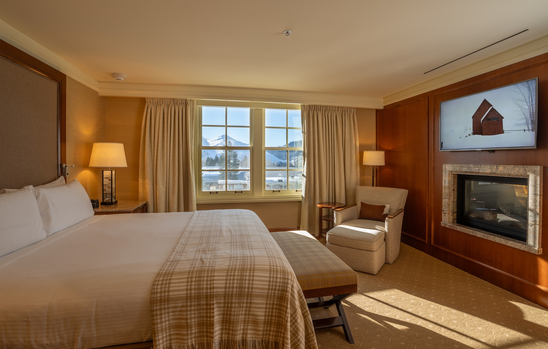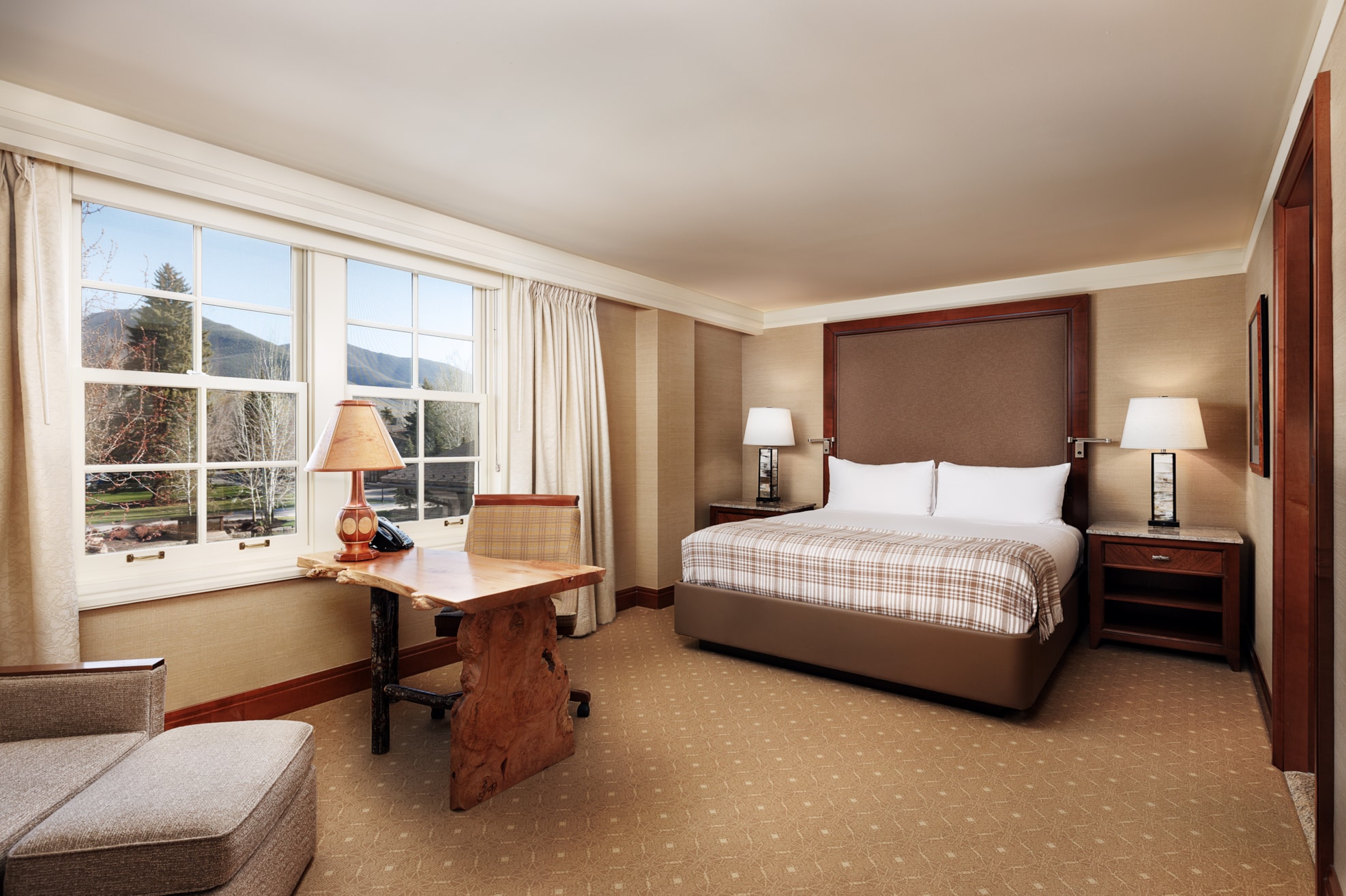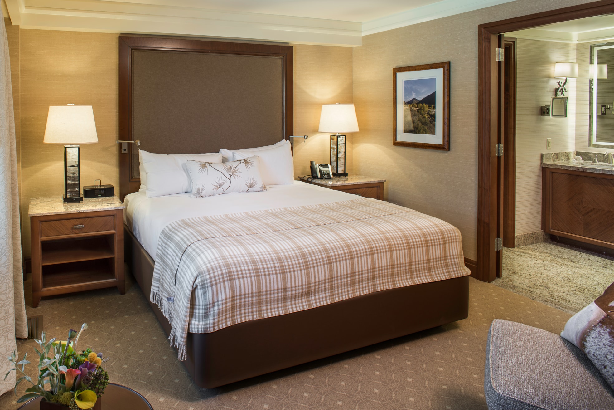 Experience classic Sun Valley luxury in these thoughtfully appointed accommodations. The welcoming bedroom features a premium king bed dressed in luxurious linens, while the spa-inspired bathroom offers a peaceful retreat with walk-in shower and dual vanity. Custom furnishings and warm textures create an inviting atmosphere, complemented by modern amenities and elegant touches throughout.