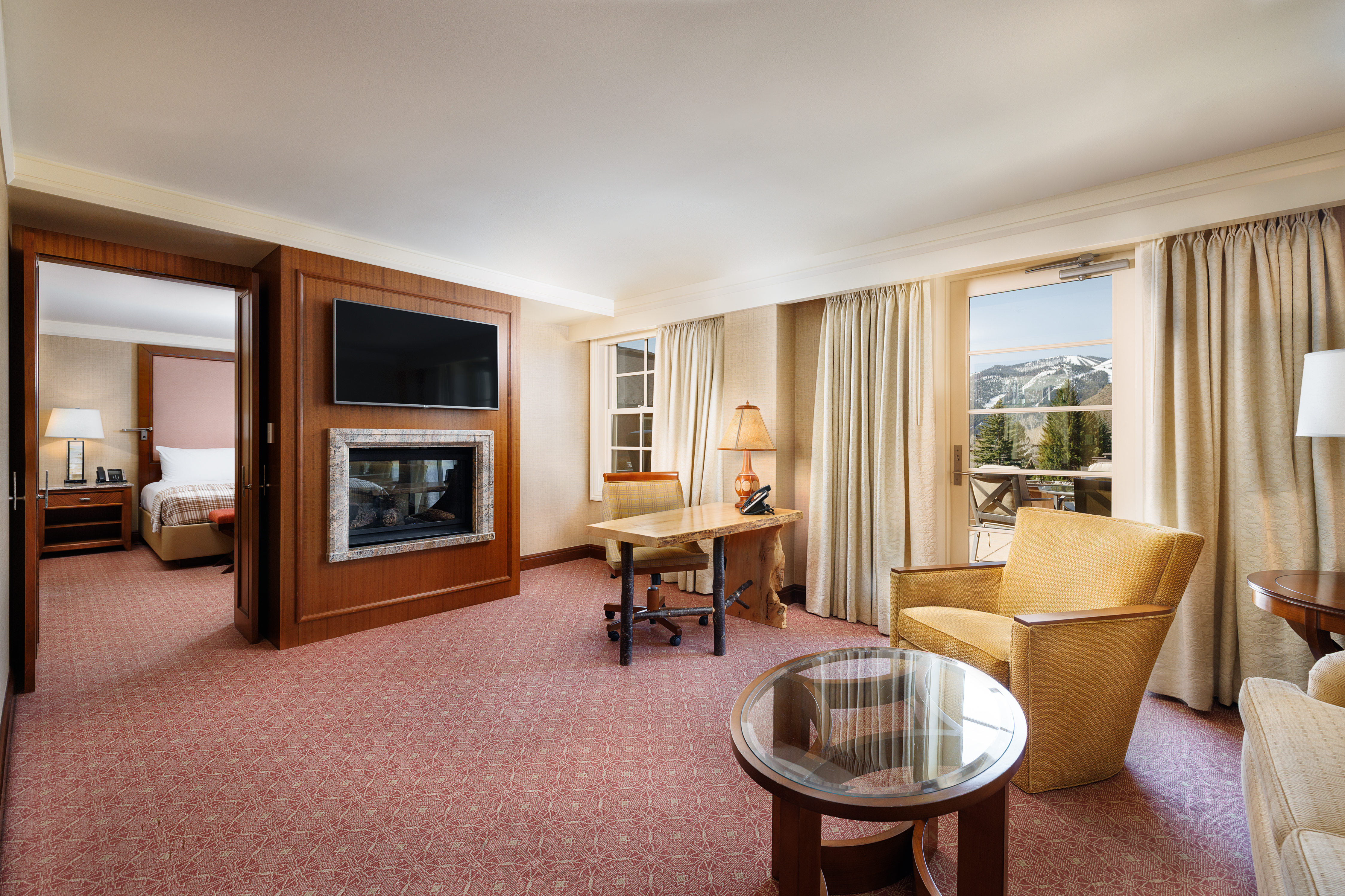 Enjoy breathtaking mountain views from these premier suites. The private terrace provides an exclusive outdoor living space, while a fireplace inside creates a cozy atmosphere. The bedroom features a luxurious king bed, while the separate living area includes a fold-out sofa for additional guests. A large tub, walk-in shower, and dual vanity in the spa-inspired bathroom offer the perfect end to active mountain days.